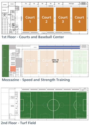 2 turf fields, 2 basketball courts, 1 volleyball court, concession area, multi-purpose rooms