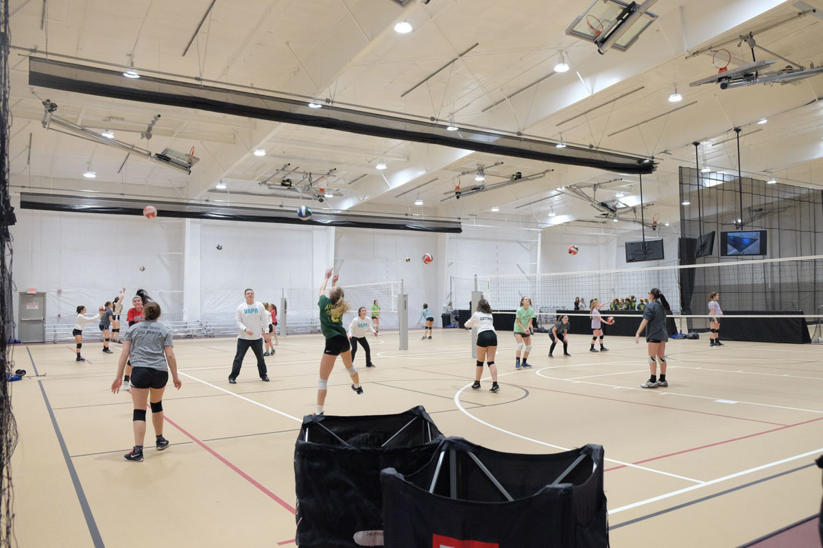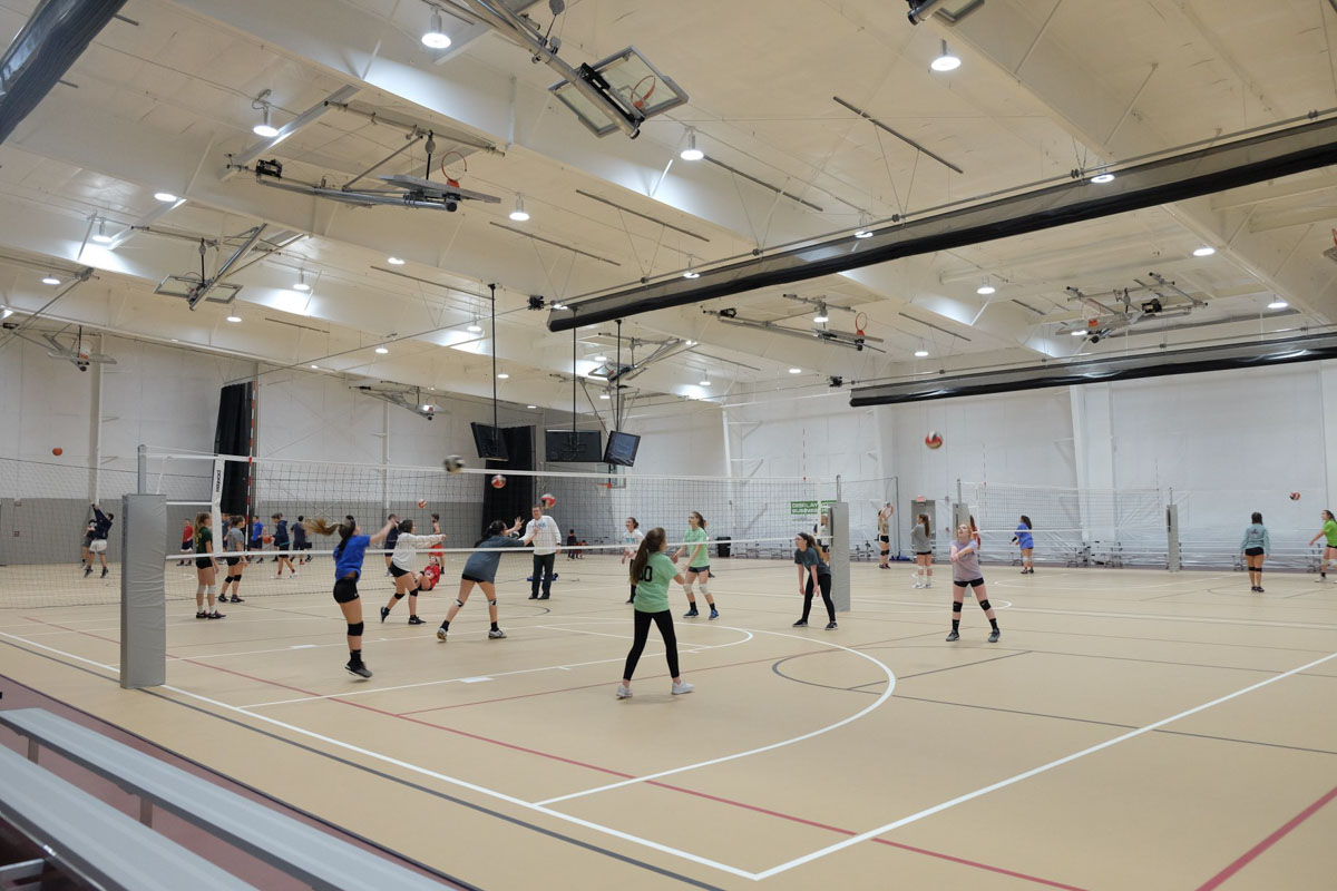 1 turf field, 3 basketball courts, 6 volleyball courts, concession area, multi-purpose rooms