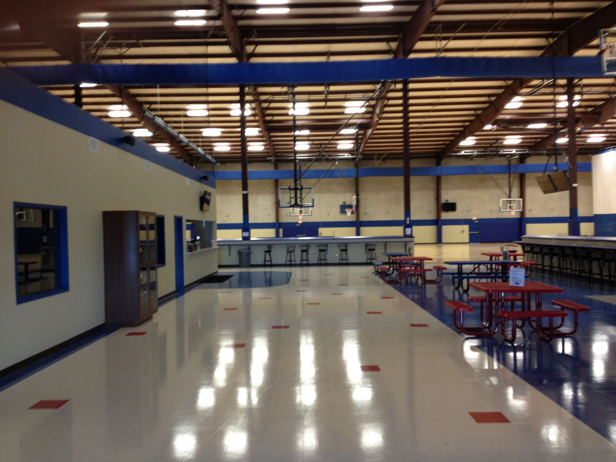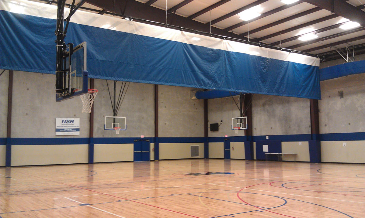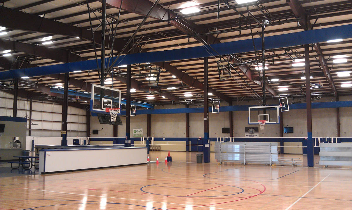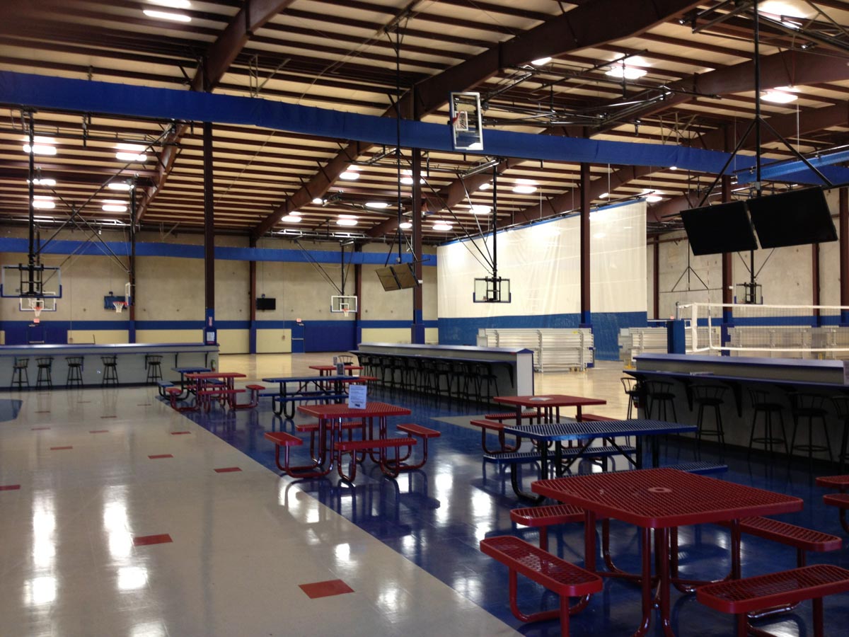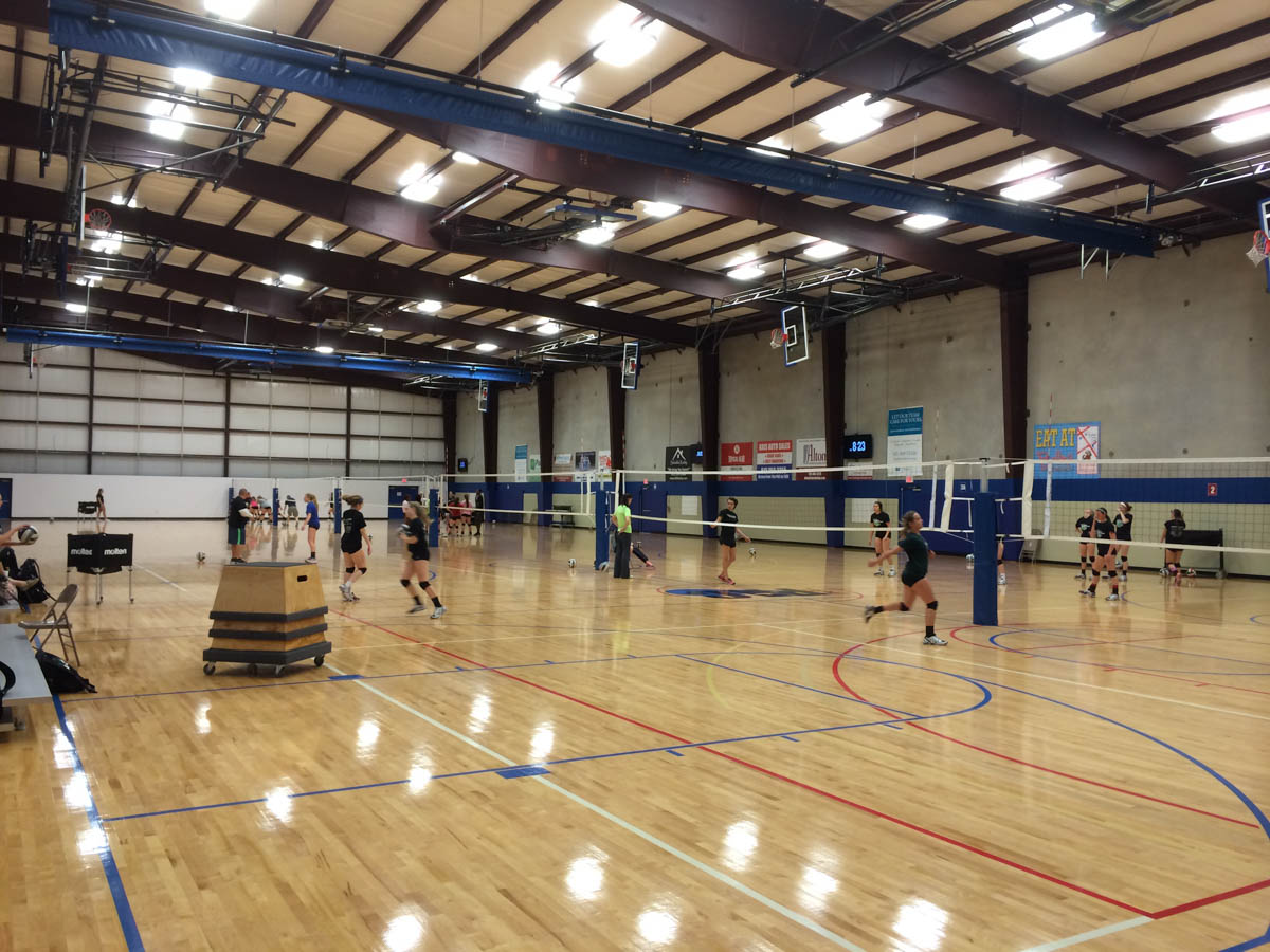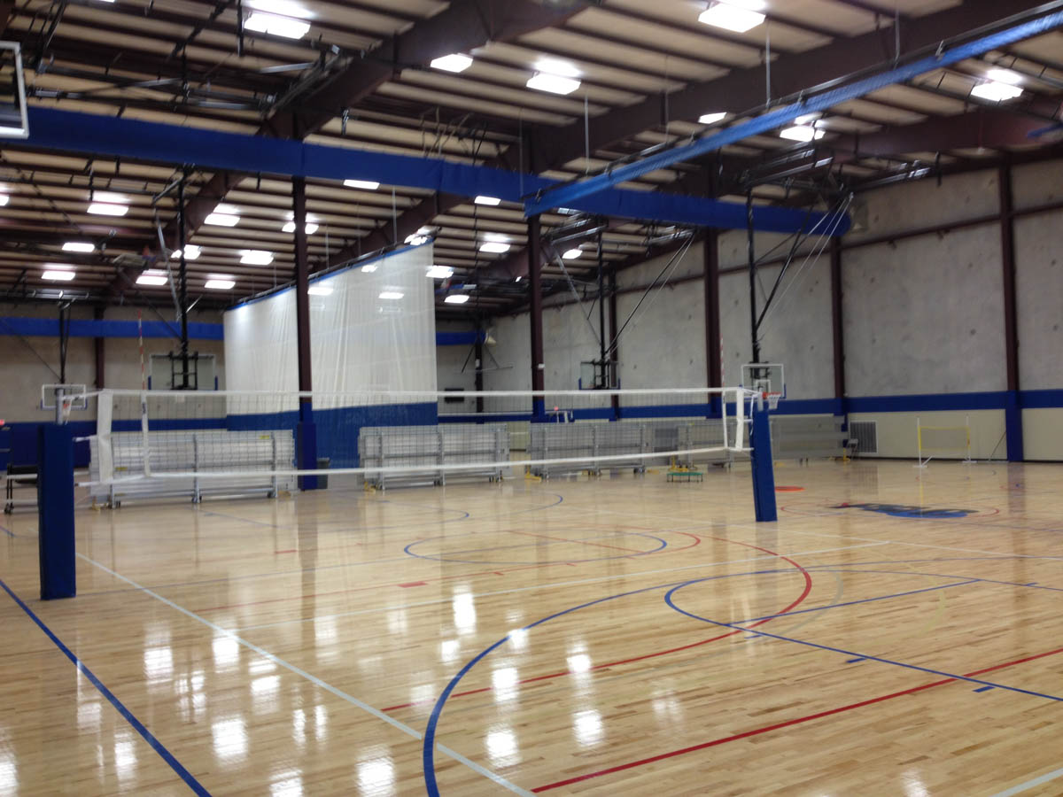 The facility includes three regulation high school basketball courts (50’ by 84’) which can each be reconfigured to accommodate six youth basketball courts (42’ by 74’), six tournament volleyball courts (30’ by 60’), or nine practice volleyball courts.